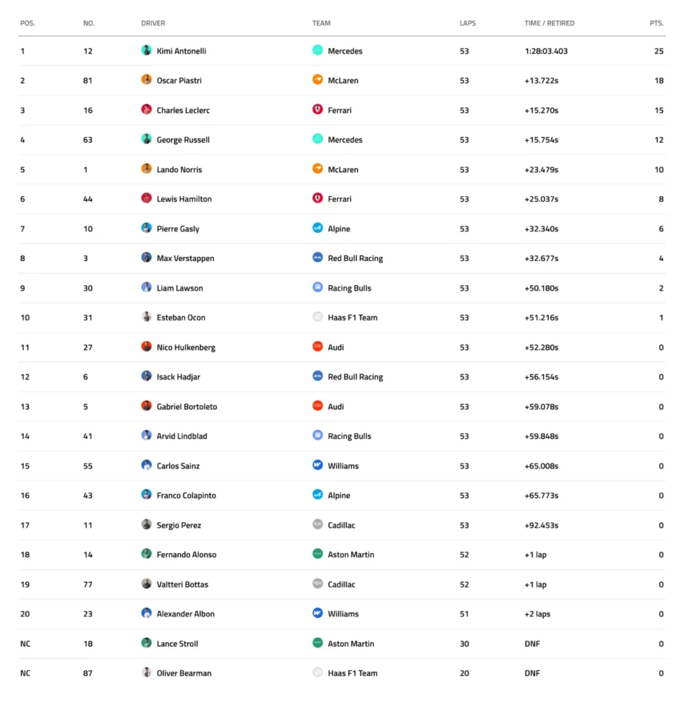 A partir daí, o jovem piloto executou uma relargada segura e controlou a corrida com tranquilidade. Além disso, Antonelli abriu vantagem na ponta e recebeu a bandeirada com 13s722 de frente sobre Piastri. Consequentemente, a vitória também o colocou na liderança do Mundial de Pilotos.