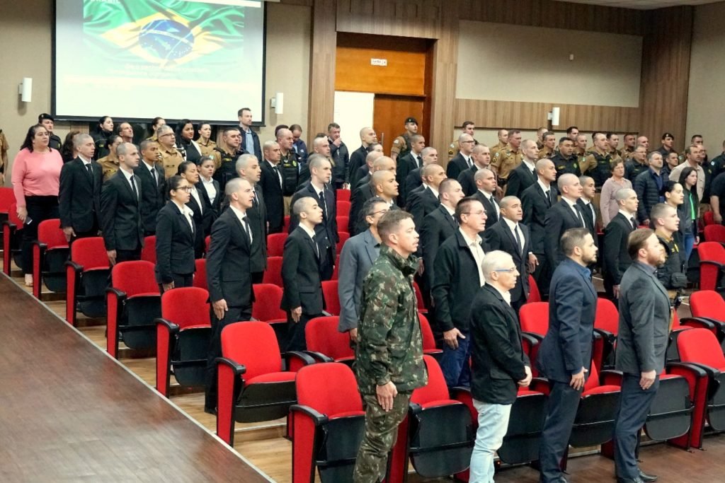 A aula magna, que reuniu aproximadamente 150 pessoas na sede da Associação dos Municípios do Sudoeste do Paraná (Amsop), marca o início do Curso de Formação de Praças Policiais Militares. Durante pronunciamento de introdução, o 2º tenente Vinicius Evangelista Scarsi, coordenador da turma que realizará o curso na sede do 21º BPM, explicou que, “o processo de formação dos novos soldados conta com mais de 1.600 horas aulas, divididas em 46 disciplinas presenciais e outras duas realizadas de forma remota, na plataforma do Ministério da Justiça”.