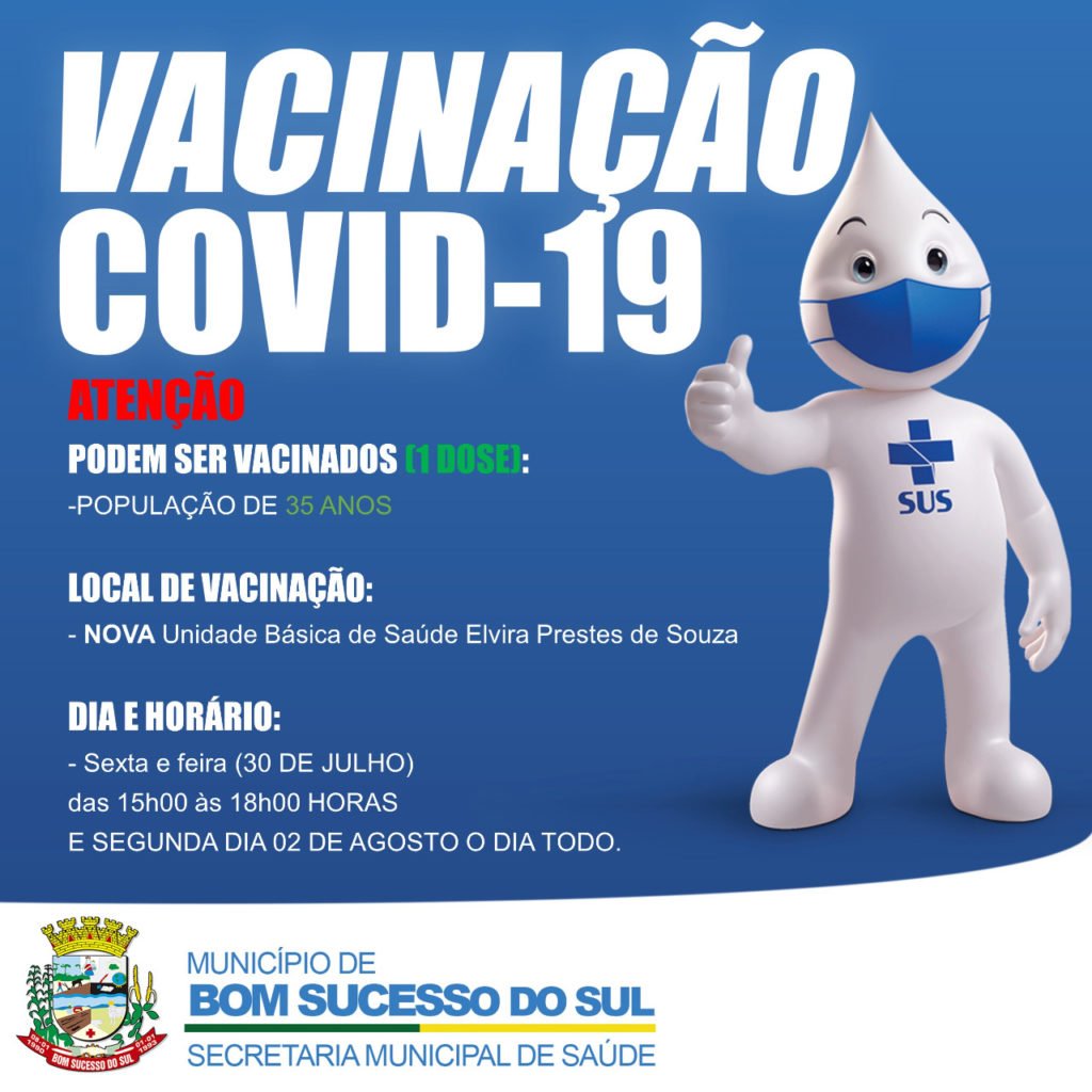 Nesta segunda-feira (2), a Secretaria de Saúde de Bom Sucesso do Sul está vacinando com a primeira dose contra a covid-19, a população com 35 anos acima.