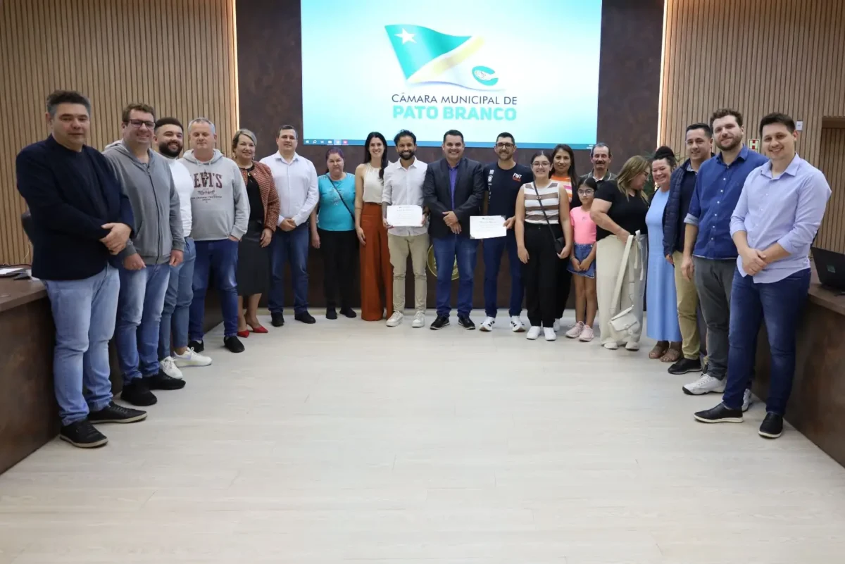 O Legislativo Municipal entregou Moções de Aplauso ao treinador Maycon Diego da Rosa e ao maratonista Paulo Henrique Tumelero, que levam o nome de Pato Branco ao cenário esportivo nacional. Maycon, com mais de 20 anos dedicados ao esporte, acumula títulos e atua como treinador de alto rendimento. Paulo Tumelero, maratonista com 66 pódios em mais de 70 provas, figura entre os melhores do Brasil na categoria 40 a 44 anos.