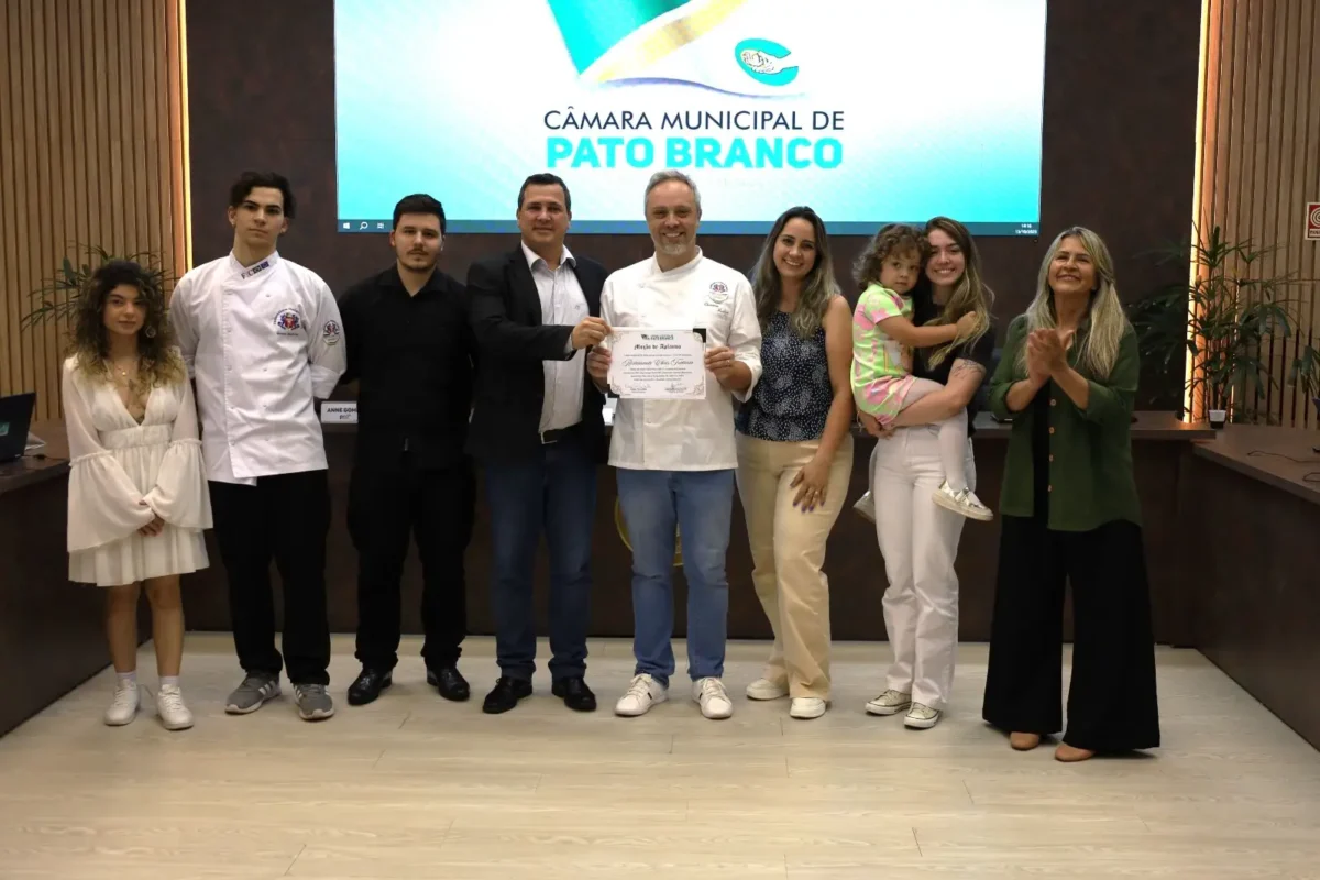 Em reconhecimento público, foi entregue durante a sessão desta quarta-feira 15 de outubro no plenário da Câmara, a Moção de Aplauso nº 18/2025, de autoria do vereador Fabricio Preis de Mello (PL), ao Restaurante Chris Trattoria, de Pato Branco, pela conquista do título de um dos 30 melhores restaurantes do Paraná pelo Prêmio Bom Gourmet 2024, em parceria com o Viaje Paraná e Sebrae-PR.