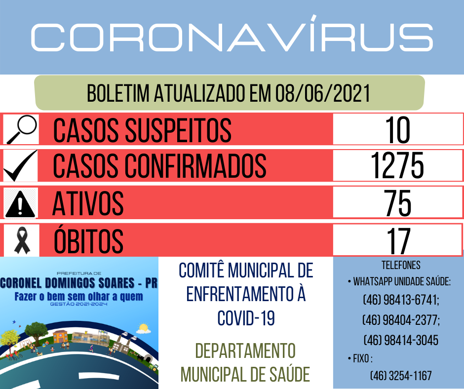 A Secretaria Municipal de Saúde de Coronel Domingos Soares divulgou, na terça-feira (8), novo boletim epidemiológico da covid-19.