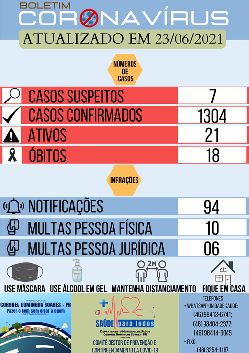 A Secretaria Municipal de Saúde de Coronel Domingos Soares divulgou, na quarta-feira (23), novo boletim epidemiológico da covid-19.