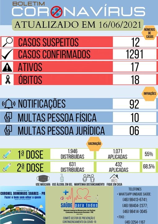 A Secretaria Municipal de Saúde de Coronel Domingos Soares divulgou, na quarta-feira (16), novo boletim epidemiológico da covid-19.