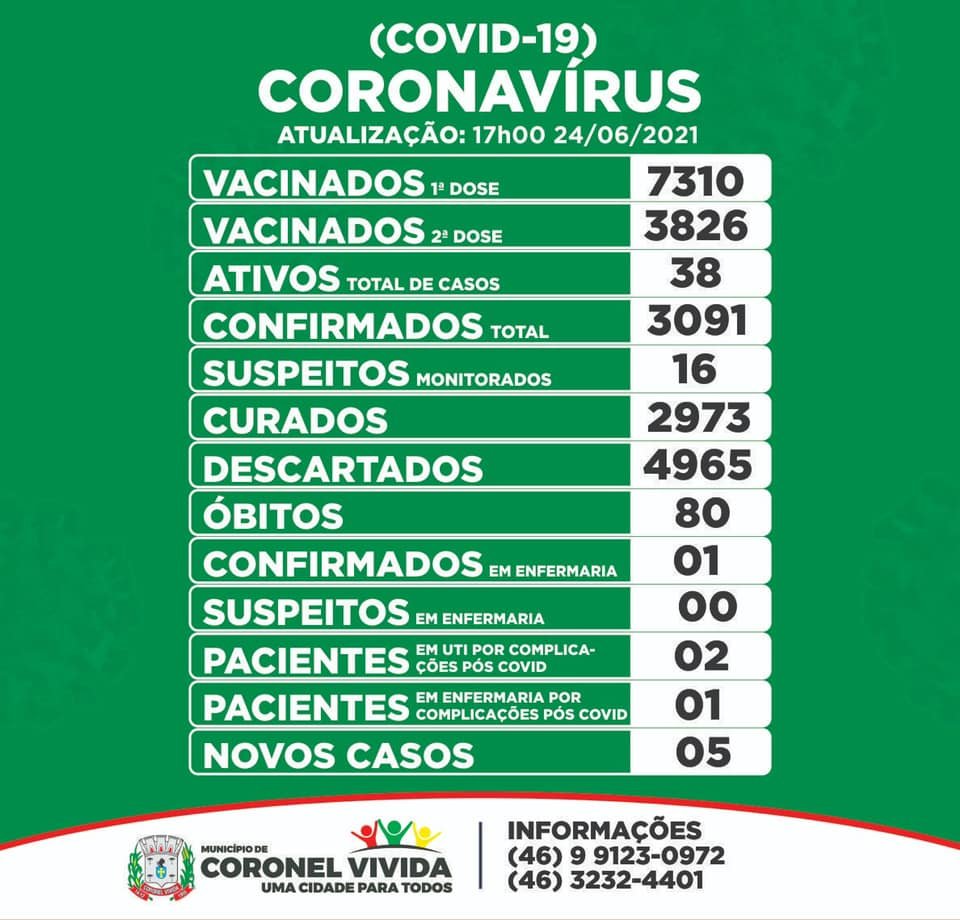 A Secretaria Municipal de Saúde de Coronel Vivida divulgou, na quinta-feira (24), novo boletim epidemiológico da covid-19.