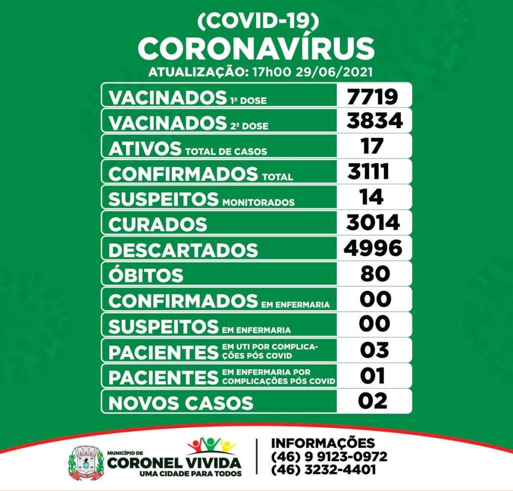 A Secretaria Municipal de Saúde de Coronel Vivida divulgou, na terça-feira (29), novo boletim epidemiológico da covid-19.