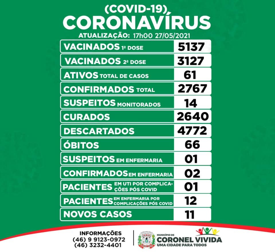 A Secretaria Municipal de Saúde de Coronel Vivida divulgou, na quinta-feira (27), novo boletim epidemiológico da covid-19.