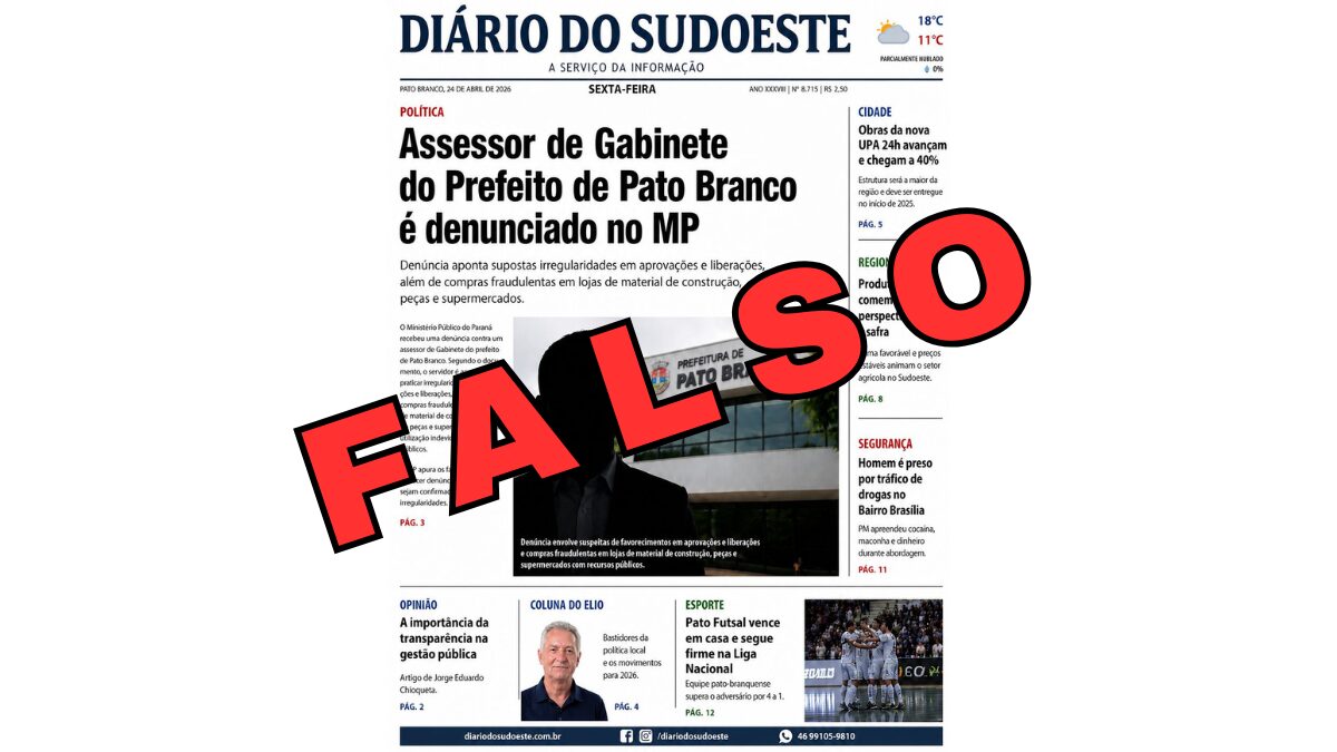O Diário do Sudoeste repudia o uso indevido de sua marca por pessoas não autorizadas, que reproduziram um jornal falso utilizando o nome do veículo. A conduta é enganosa e grave.