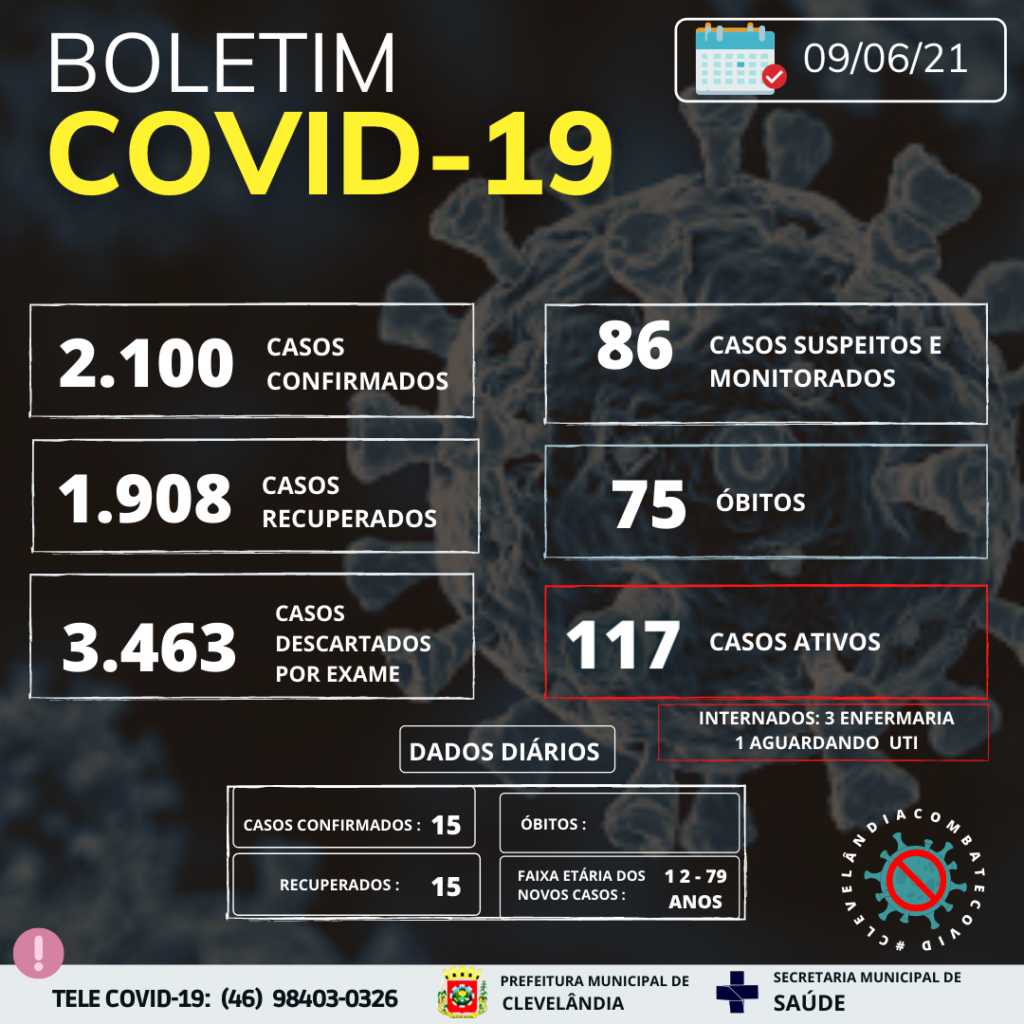 A Secretaria Municipal de Saúde de Clevelândia divulgou, na quarta-feira (9), novo boletim epidemiológico da covid-19.