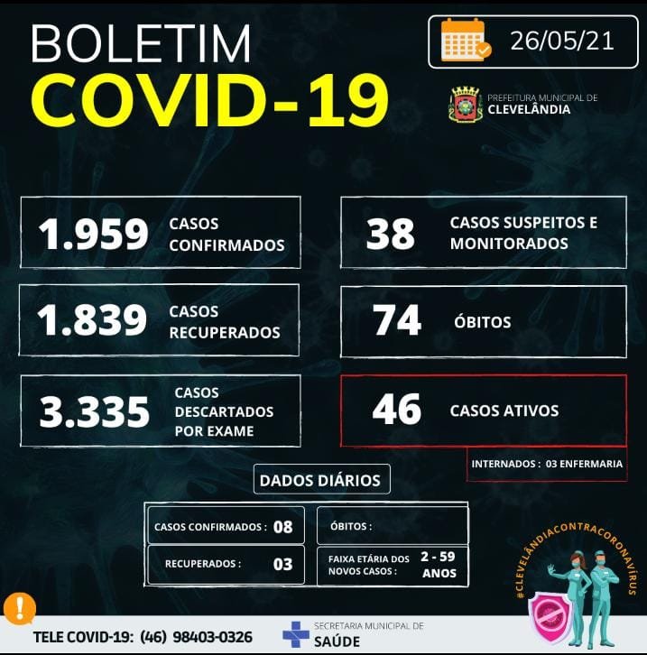 A Secretaria Municipal de Saúde de Clevelândia divulgou, na quarta-feira (26), novo boletim epidemiológico da covid-19.