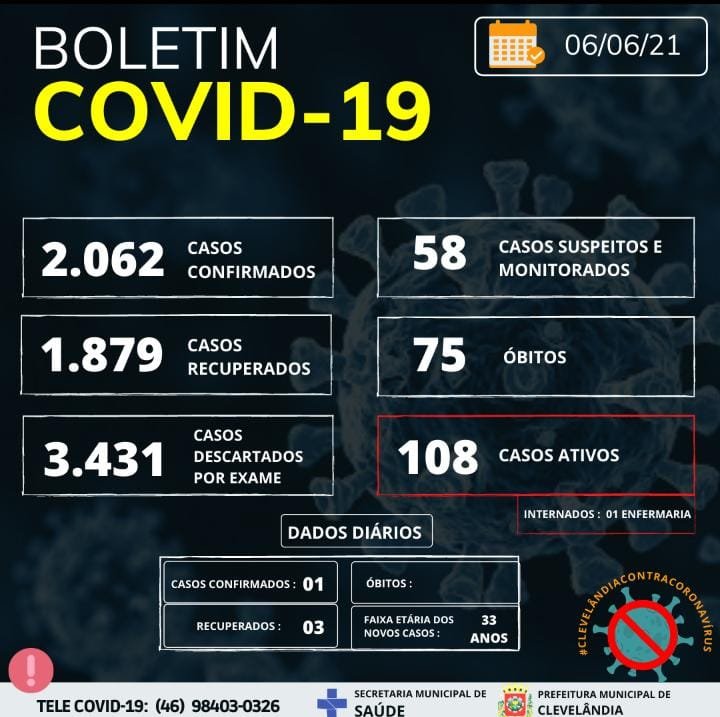 A Secretaria Municipal de Saúde de Clevelândia divulgou, no domingo (6), novo boletim epidemiológico da covid-19.