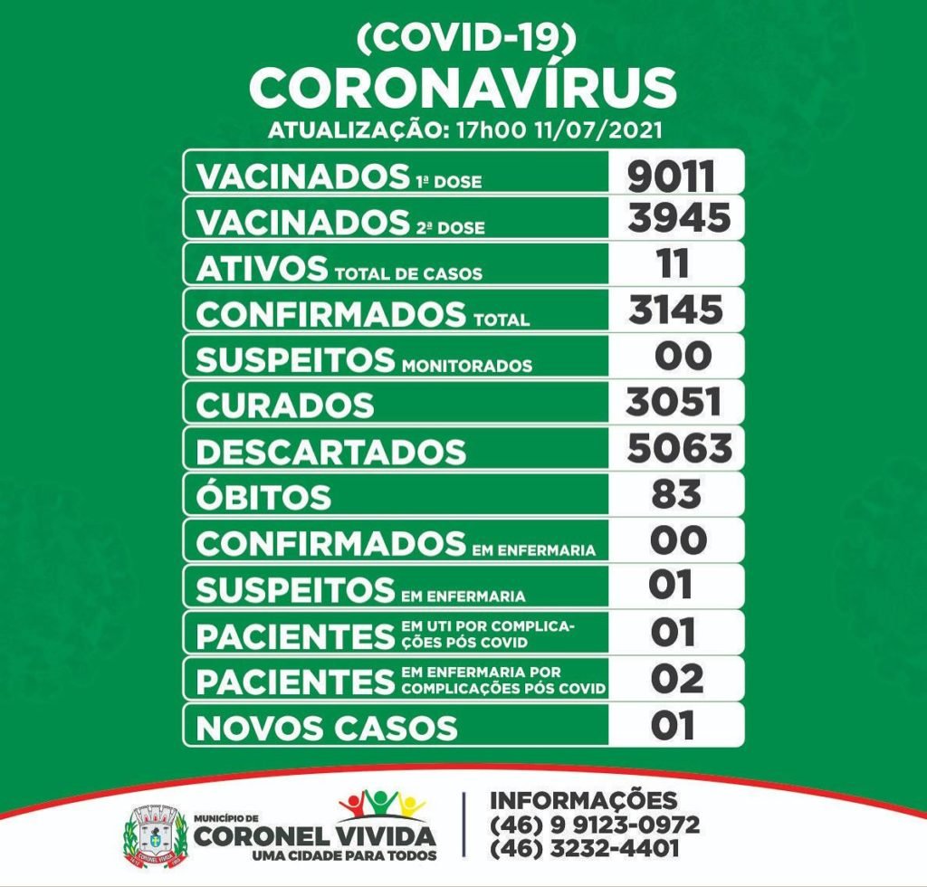 A Secretaria Municipal de Saúde de Coronel Vivida divulgou, no domingo (11), novo boletim epidemiológico da covid-19.
