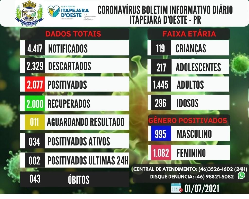 A Secretaria Municipal de Saúde de Itapejara D’Oeste divulgou, na quinta-feira (1º), novo boletim epidemiológico da covid-19.