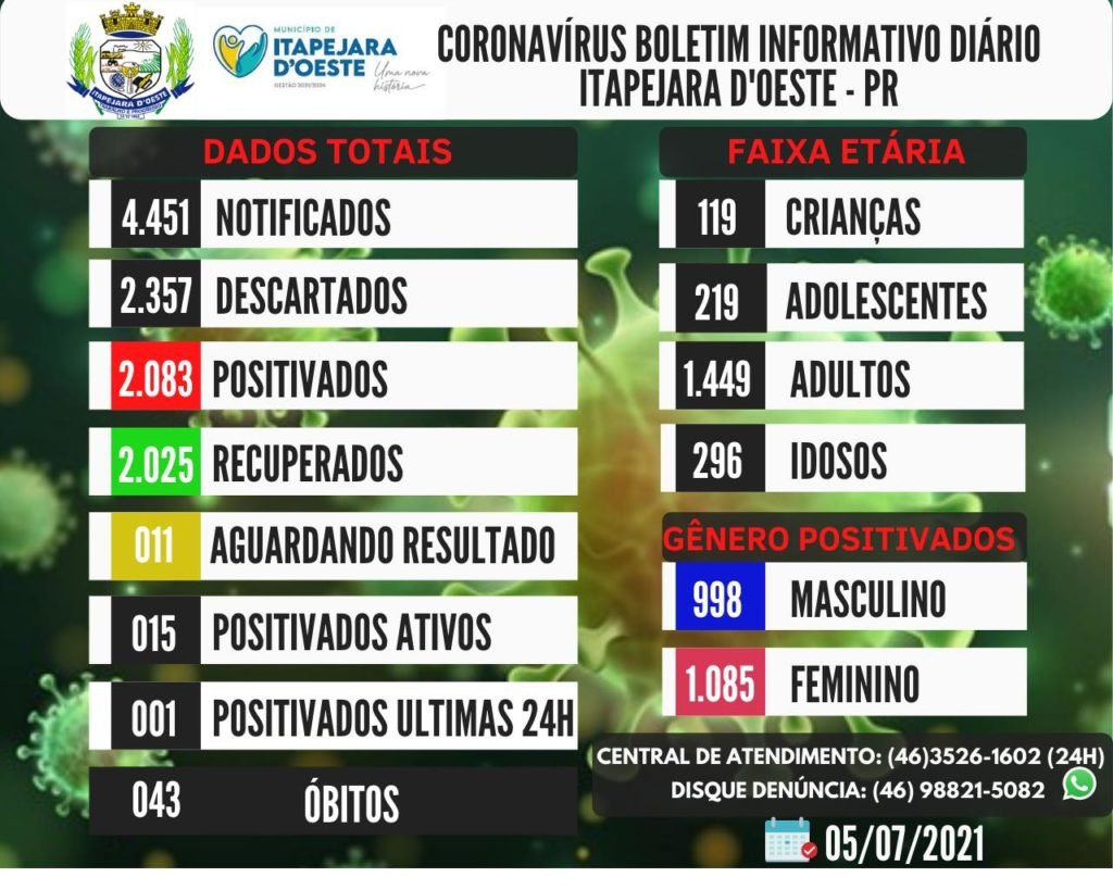 A Secretaria Municipal de Saúde de Itapejara D’Oeste divulgou, na segunda-feira (5), novo boletim epidemiológico da covid-19.
