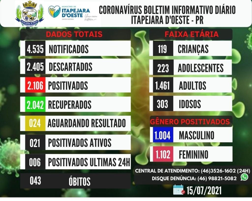 A Secretaria Municipal de Saúde de Itapejara D’Oeste divulgou, na quinta-feira (15), novo boletim epidemiológico da covid-19.