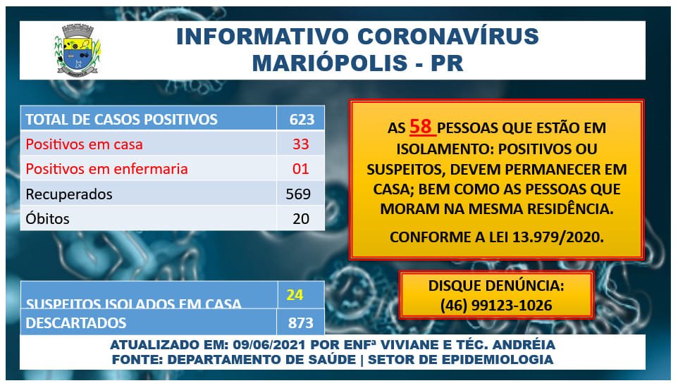 A Secretaria Municipal de Saúde de Mariópolis divulgou, na quarta-feira (9), novo boletim epidemiológico da covid-19.