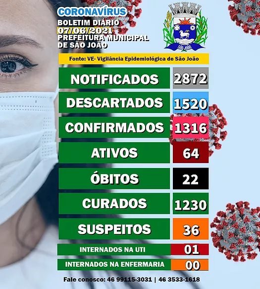 A Secretaria Municipal de Saúde de São João divulgou, na segunda-feira (7), novo boletim epidemiológico da covid-19.