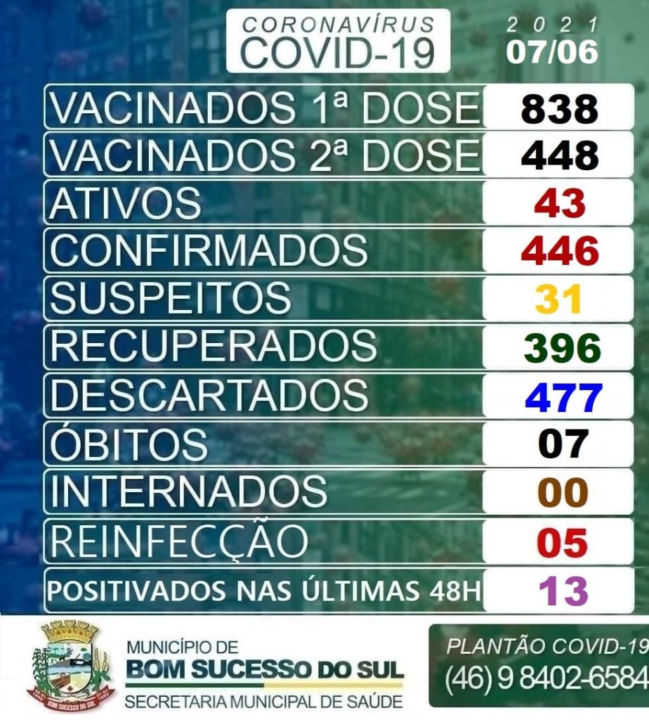 A Secretaria Municipal de Saúde de Bom Sucesso do Sul divulgou, na segunda-feira (7), novo boletim epidemiológico da covid-19.
