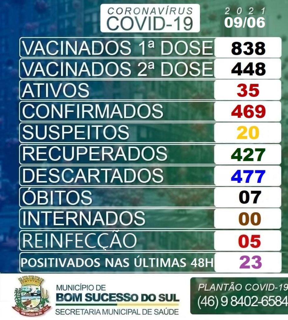 A Secretaria Municipal de Saúde de Bom Sucesso do Sul divulgou, na quarta-feira (9), novo boletim epidemiológico da covid-19.