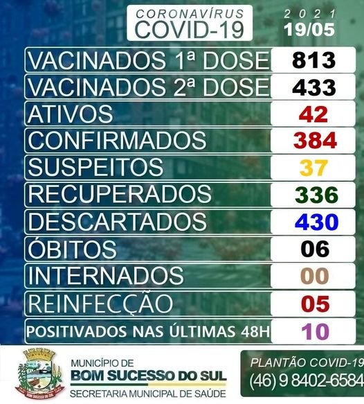 A Secretaria Municipal de Saúde de Coronel Domingos Soares divulgou, na quarta-feira (19), novo boletim epidemiológico da covid-19.