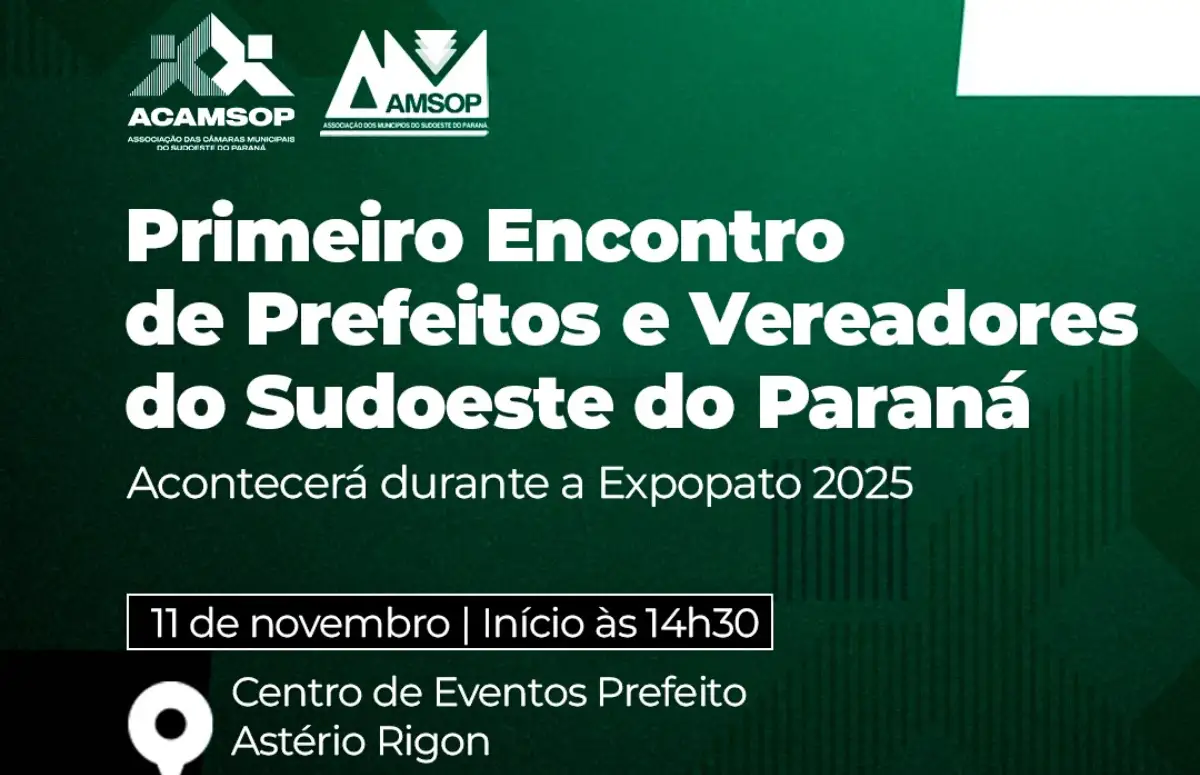 No próximo dia 11 de novembro, às 14h30, o Centro de Eventos Prefeito Astério Rigon, em Pato Branco, será palco do Primeiro Encontro de Prefeitos e Vereadores do Sudoeste do Paraná. Uma iniciativa conjunta da AMSOP (Associação dos Municípios do Sudoeste do Paraná) e da ACAMSOP (Associação das Câmaras Municipais do Sudoeste do Paraná), o evento acontecerá durante a programação oficial da Expopato 2025.