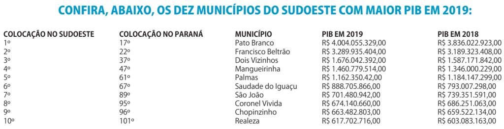 Os outros nove municípios do Sudoeste com maior PIB do Sudoeste em 2019 foram Francisco Beltrão, Dois Vizinhos, Mangueirinha, Palmas, Saudade do Iguaçu, São João, Coronel Vivida, Chopinzinho e Realeza.