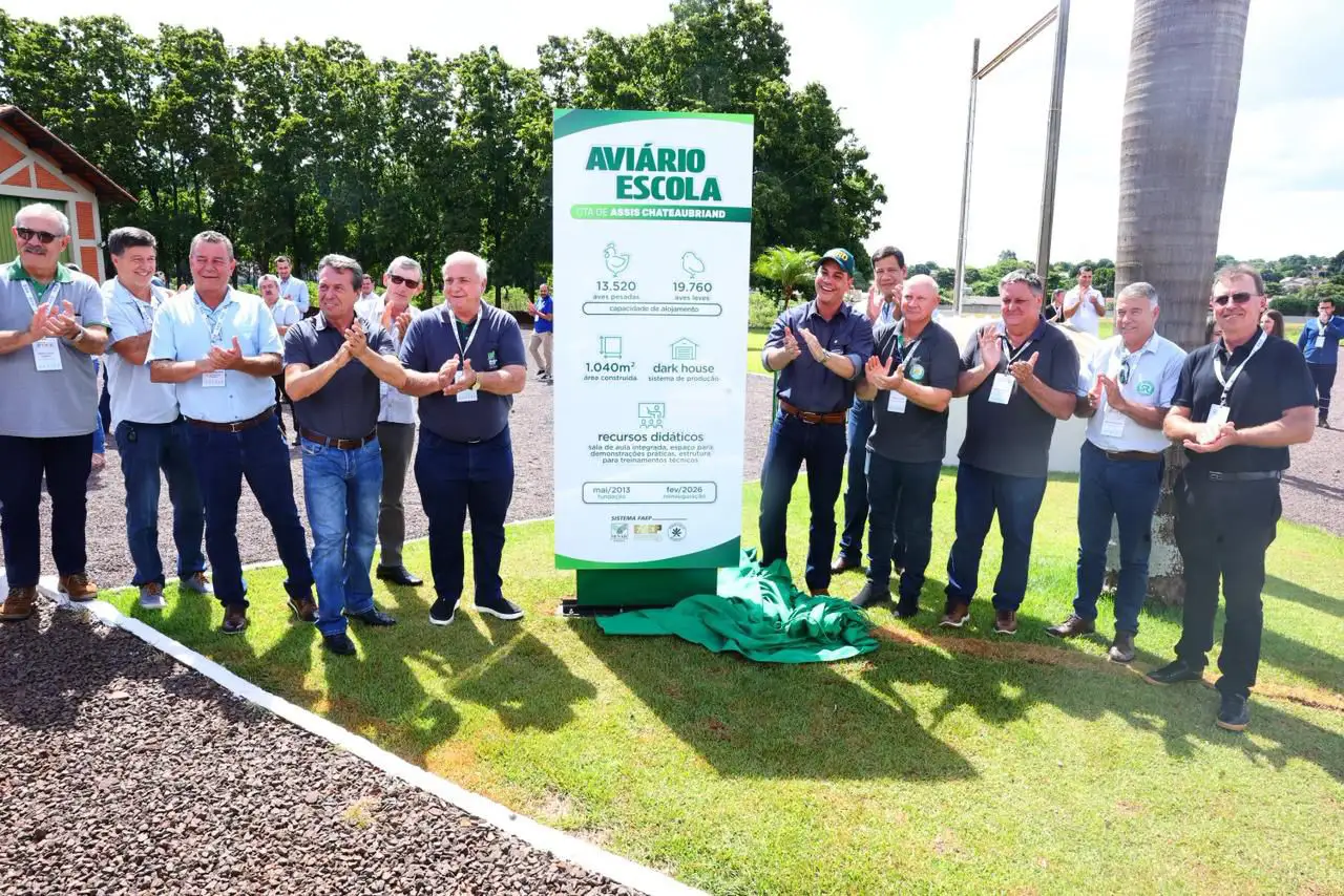 O Sistema FAEP reinaugurou, nesta segunda-feira (9), o seu aviário escola no Centro de Treinamento Agropecuário (CTA) de Assis Chateaubriand, na região Oeste do Estado. A nova estrutura amplia a capacidade de formação de profissionais e produtores na avicultura, setor em que o Paraná é destaque nacional. O evento reuniu cerca de 100 pessoas, entre autoridades, lideranças do agro e parceiros institucionais.