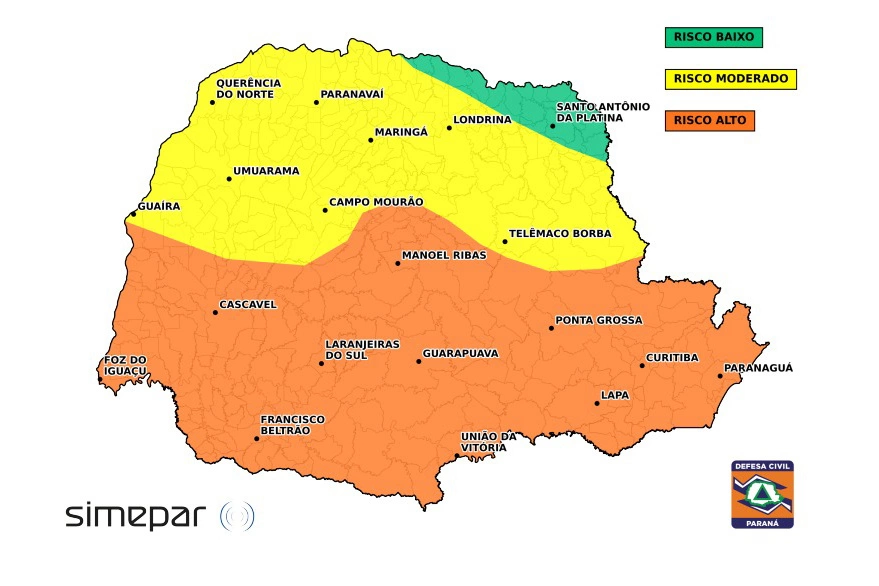 O Boletim de Gestão de Riscos, elaborado pelo Simepar em parceria com a Defesa Civil Estadual, aponta risco alto nesta sexta-feira (20) em toda a metade sul do Paraná para tempestades pontualmente severas. Entre os impactos previstos estão chuva intensa em curto período, alagamentos, rajadas fortes de vento, destelhamentos e queda de galhos de árvores.
