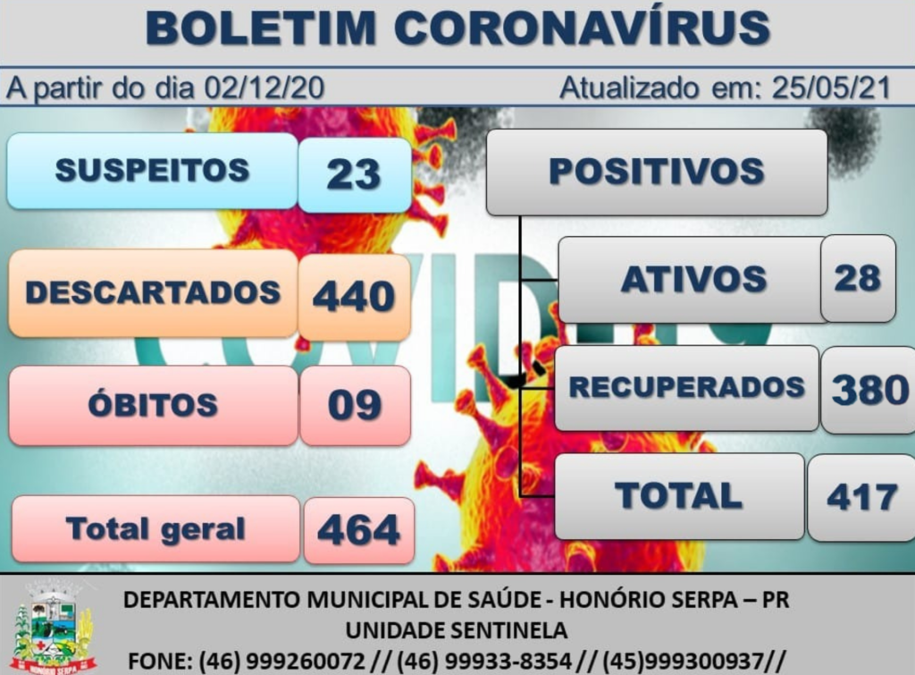 A Secretaria Municipal de Saúde de Honório Serpa divulgou, na terça-feira (25), novo boletim epidemiológico da covid-19.