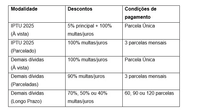 Para outros débitos, os descontos variam de 40% a 100% sobre multas e juros, com possibilidade de parcelamento em até 120 meses.