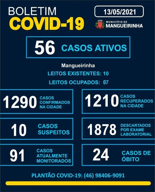 A Secretaria Municipal de Saúde de Mangueirinha divulgou, na quinta-feira (13), novo boletim epidemiológico da covid-19.