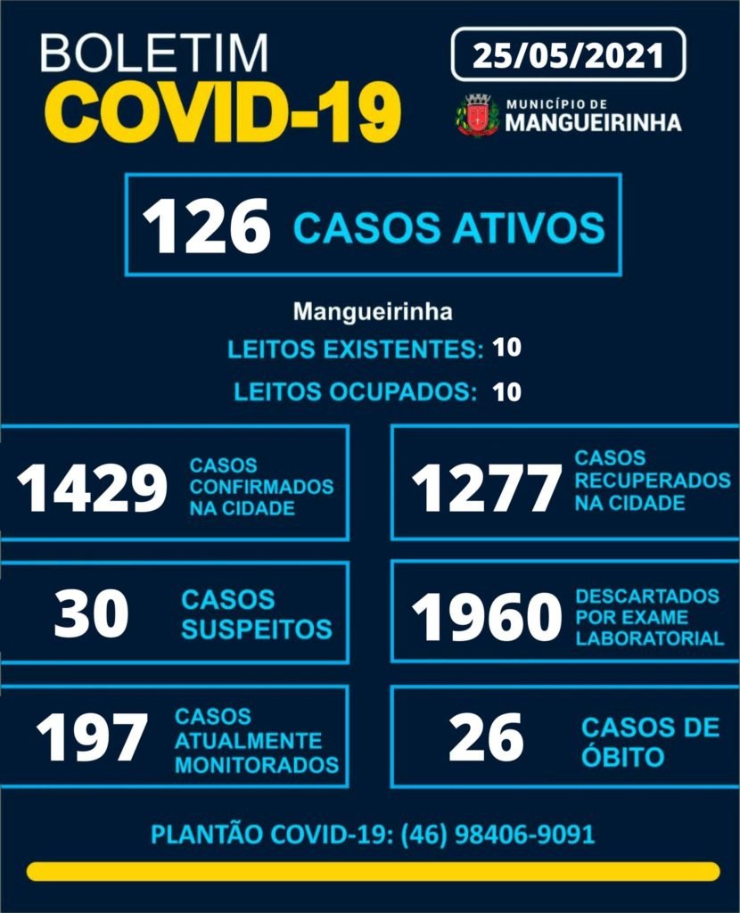 A Secretaria Municipal de Saúde de Mangueirinha divulgou, na terça-feira (25), novo boletim epidemiológico da covid-19.