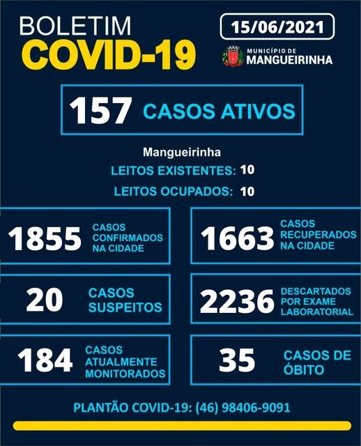 A Secretaria Municipal de Saúde de Mangueirinha divulgou, nesta terça-feira (15), novo boletim epidemiológico da covid-19.
