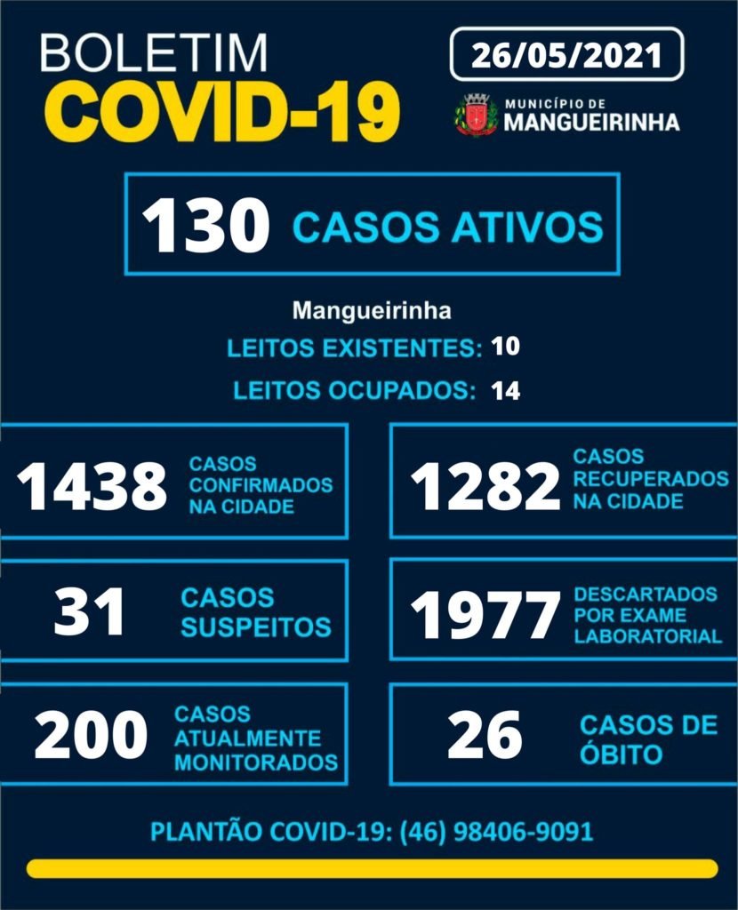 A Secretaria Municipal de Saúde de Mangueirinha divulgou, na quarta-feira (26), novo boletim epidemiológico da covid-19.