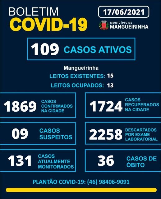 A Secretaria Municipal de Saúde de Mangueirinha divulgou, nesta quinta-feira (17), novo boletim epidemiológico da covid-19.