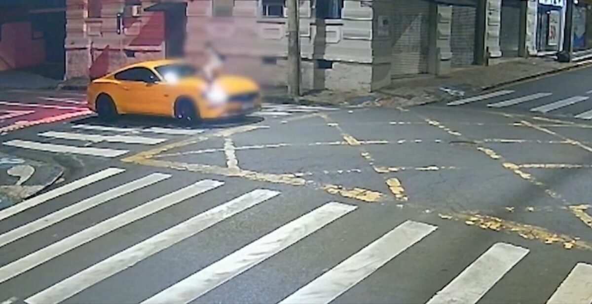 O flagrante foi registrado por câmeras de segurança instaladas na região central, mostrando o veículo em movimento com a mulher sobre o capô.