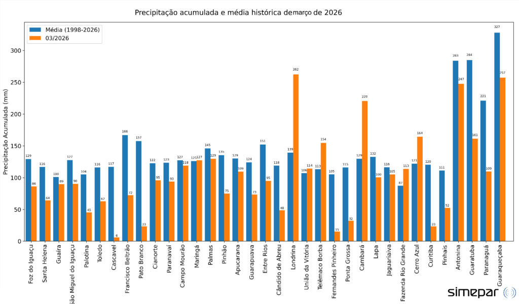 A primeira estação meteorológica a atingir a média histórica de chuva em março de 2026 foi a de Londrina. Apesar de ter registrado precipitação em apenas 12 dos 31 dias do mês, os volumes foram altos. O município acumulou 78 mm no dia 8, 87,2 mm no dia 9 e 38,2 mm no dia 10. No total, Londrina fechou março com 262,4 mm, enquanto a média histórica para o período é de 139,4 mm.