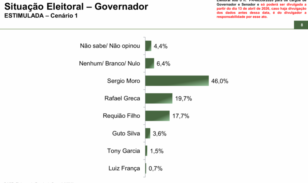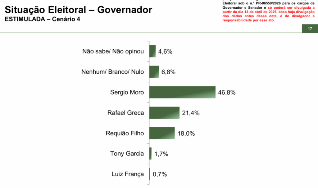 No quarto cenário, Moro tem 46,8%, seguido por Rafael Greca, com 21,4%, e Requião Filho, com 18%. Tony Garcia aparece com 1,7% e Luiz França com 0,7%. Não sabem ou não opinaram somam 4,6%, enquanto brancos e nulos chegam a 6,8%.