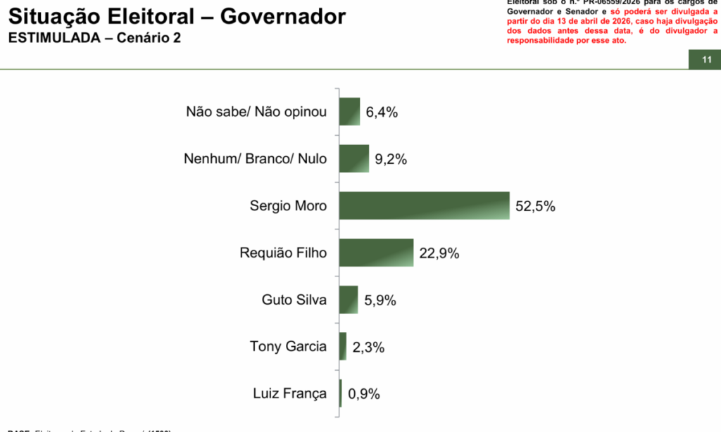 No segundo cenário, sem a presença de Rafael Greca, Moro amplia a vantagem e chega a 52,5%. Requião Filho aparece com 22,9%, seguido por Guto Silva (5,9%), Tony Garcia (2,3%) e Luiz França (0,9%). Não sabem ou não opinaram somam 6,4% e brancos e nulos 9,2%.