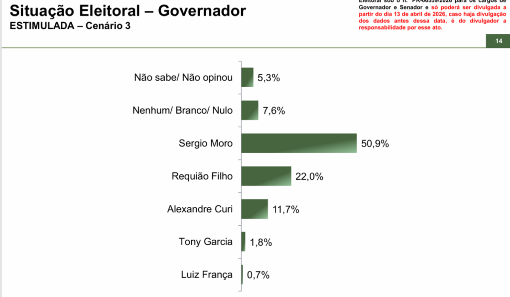 No terceiro cenário, Moro registra 50,9% das intenções de voto. Requião Filho aparece com 22%, enquanto Alexandre Curi (Republicanos) soma 11,7%. Tony Garcia tem 1,8% e Luiz França 0,7%. Não sabem ou não opinaram representam 5,3% e brancos ou nulos 7,6%.