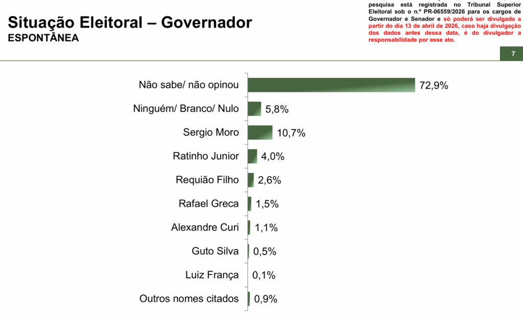 Neste cenário, Sergio Moro aparece com 10,7%, seguido pelo governador Ratinho Júnior (PSD), com 4%. Requião Filho soma 2,6%, Rafael Greca 1,5%, Alexandre Curi 1,1% e Guto Silva 0,5%. Luiz França registra 0,1%, enquanto outros nomes somam 0,9%. Brancos e nulos representam 5,8%.