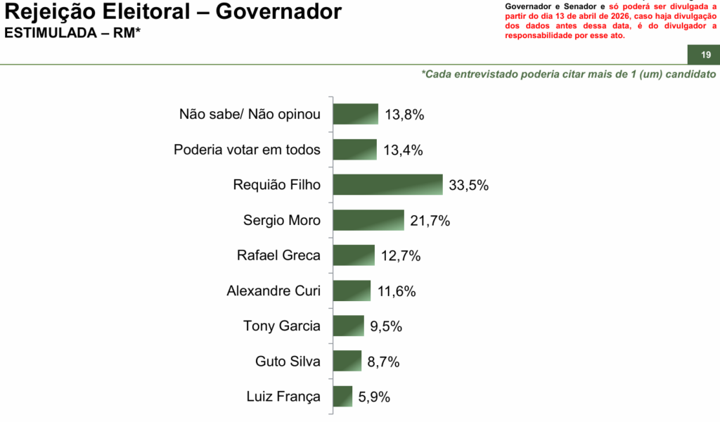 A pesquisa também avaliou o índice de rejeição dos candidatos ao Governo. Requião Filho lidera com 33,5%, seguido por Sergio Moro, com 21,7%. Rafael Greca aparece com 12,7%, Alexandre Curi com 11,6%, Tony Garcia com 9,5%, Guto Silva com 8,7% e Luiz França com 5,9%.