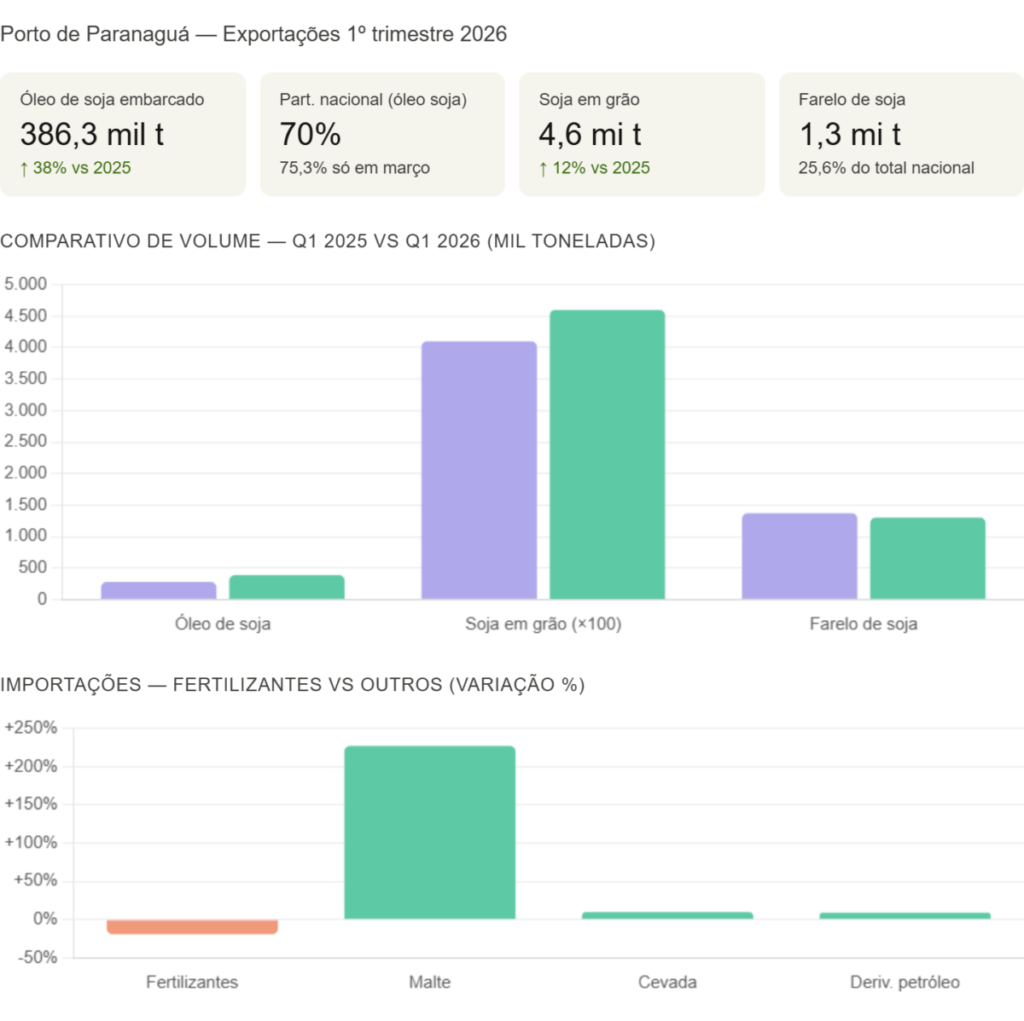 O Porto de Paranaguá respondeu por 70% das exportações brasileiras de óleo de soja entre janeiro e março de 2026. No período, o porto paranaense embarcou 386,3 mil toneladas do produto, segundo dados do Comex Stat, sistema federal de comércio exterior.