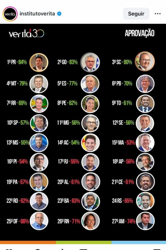 O levantamento mostra outros nomes entre os governadores mais bem avaliados do País. Mauro Mendes, do Mato Grosso, aparece com 79% de aprovação. Renato Casagrande, do Espírito Santo, marca 77%. Por fim, João Azevêdo, da Paraíba, registra 70% de aprovação positiva.