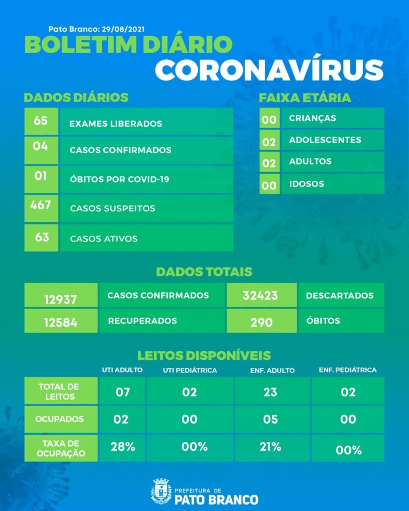 De acordo com o boletim divulgado na tarde deste domingo (29) pela prefeitura de Pato Branco, o município registrou mais um óbito por consequência da covid-19. A vítima é uma mulher de 86 anos de idade. Com isso, Pato Branco chegou aos 290 óbitos por conta da doença desde o início do monitoramento dos casos, em março de 2020.