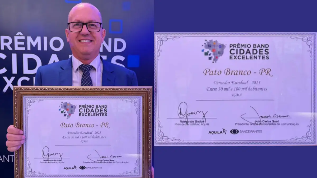 O município de Pato Branco foi destaque estadual no Prêmio Band Cidades Excelentes 2025, promovido pelo Grupo Bandeirantes de Comunicação em parceria com o Instituto Aquila. A premiação, realizada nesta quarta-feira (22), reconhece as melhores práticas de gestão pública no país e celebra municípios que alcançaram resultados de excelência em transparência, eficiência e governança.