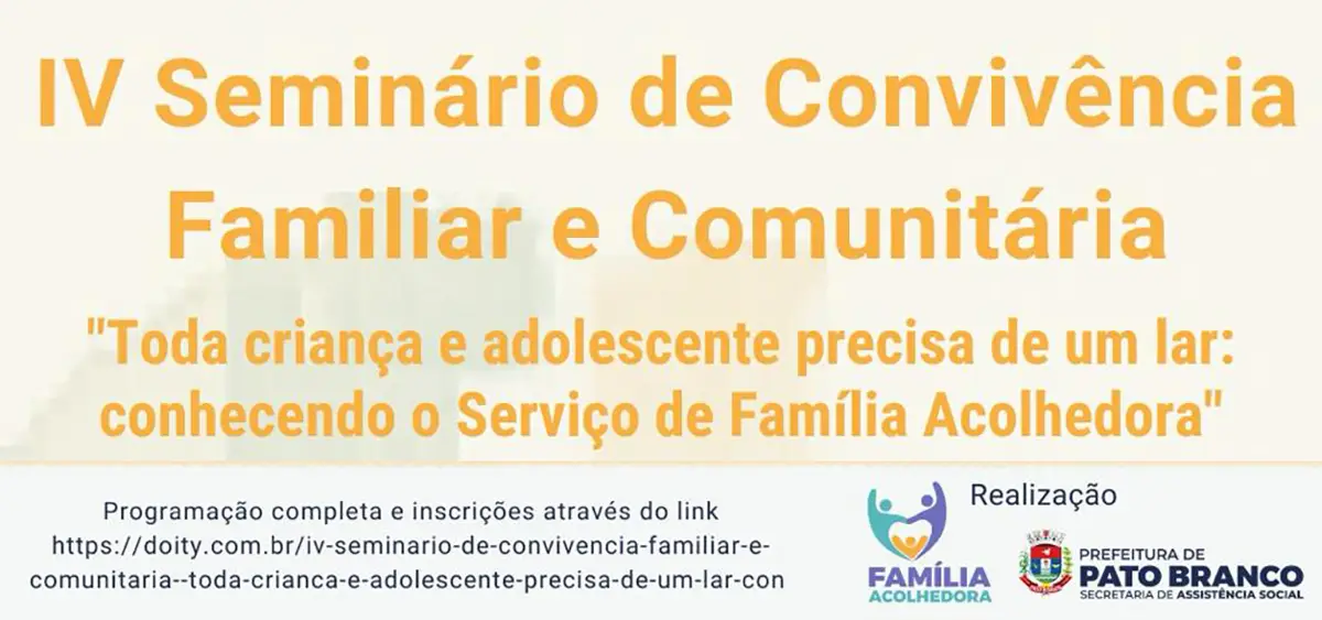A Prefeitura de Pato Branco promove nesta quinta-feira (9) o IV Seminário de Convivência Familiar e Comunitária. O evento ocorre a partir das 19h, no Auditório do Departamento de Cultura, no Centro de Eventos.