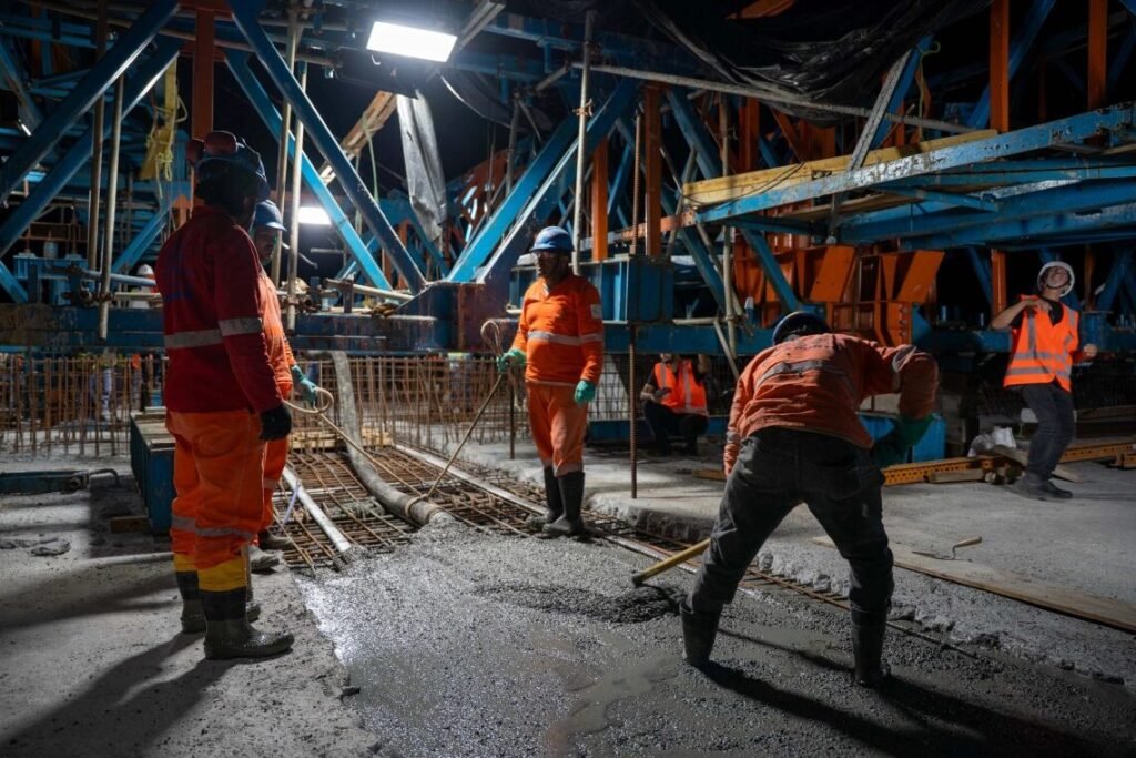 À noite, com temperaturas mais amenas e menor movimentação estrutural, a execução do fechamento ocorreu com maior segurança técnica.