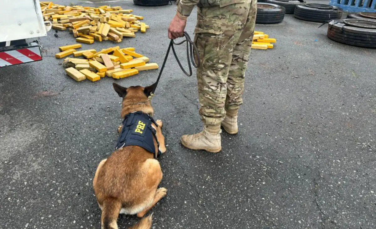 A PRF abordou dois ocupantes da carreta após detectarem informações contraditórias sobre a viagem. Cães farejadores indicaram pontos suspeitos, levando à vistoria detalhada que revelou as bolsas de haxixe e os tabletes de maconha acondicionados nos pneus.
