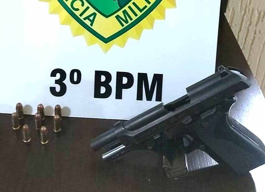 A Polícia Militar realizava patrulhamento, segunda-feira, por volta das 21h30, pela rua Benjamin Borges dos Santos, bairro Fraron, em Pato Branco, quando avistou um Gol realizando arrancadas bruscas. Os policiais abordaram o veículo e realizaram buscas no seu interior, encontrando uma pistola calibre 380, com oito munições intactas.